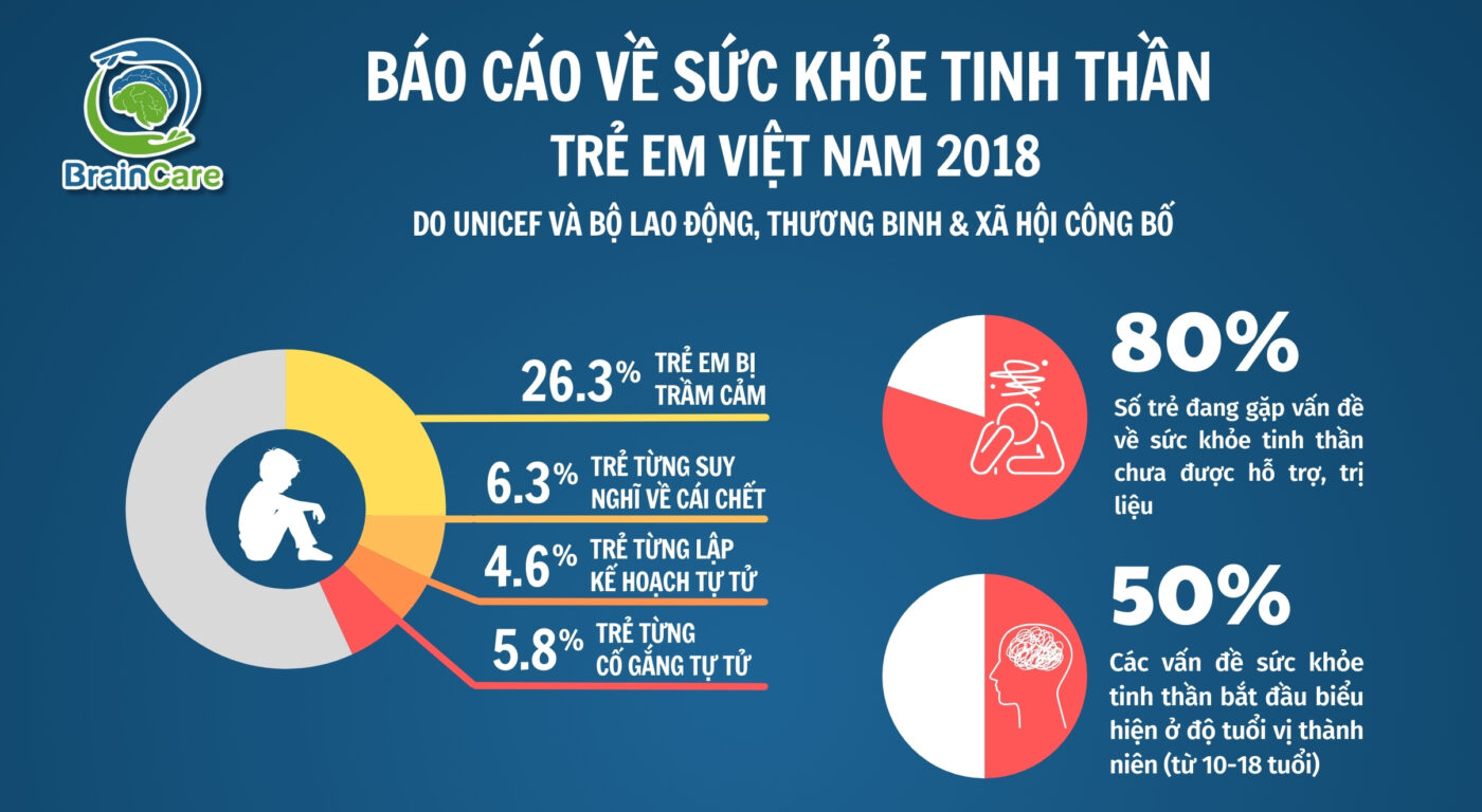 Quỹ Nhi đồng Liên Hợp Quốc (UNICEF) cảnh báo: Có tới 15% – 30% thanh thiếu niên tại Việt Nam đang đối mặt với các vấn đề về sức khỏe tâm thần. Trong đó, trẻ em gái có nguy cơ mắc trầm cảm và lo âu cao hơn đáng kể so với trẻ em trai. Bên cạnh đó, một số nghiên cứu nội bộ của Bệnh viện Nhi Trung Ương cũng cho thấy 26,3% trẻ em bị trầm cảm; 6,3% trẻ từng nghĩ đến cái chết: 4,6% trẻ đã lên kế hoạch tự tử; và 5,8% trẻ đã từng cố gắng tự tử. Trong một cuộc khảo sát khác tại Hà Nội (2012-2013), 21,4% trẻ em gái và 7,9% trẻ em trai trong độ tuổi 16-18 đã từng có ý nghĩ tự tử chỉ trong vòng một năm.
