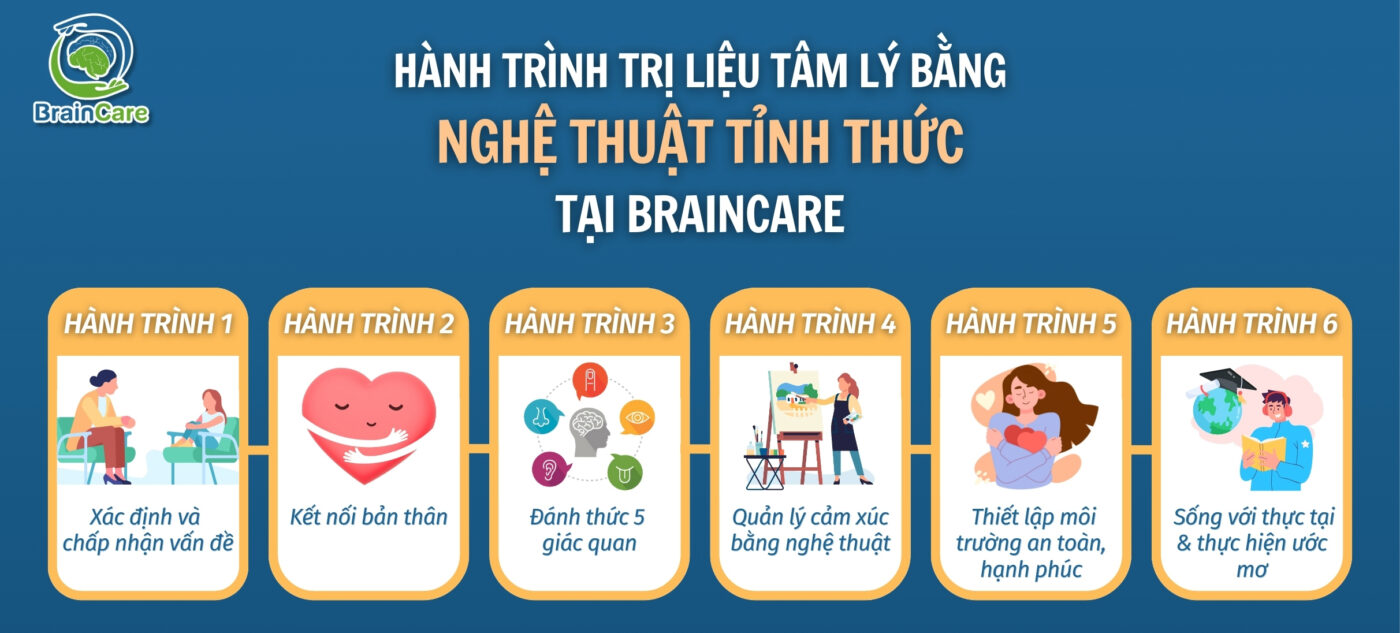 • Liệu pháp Nghệ thuật tỉnh thức (MBTA): giúp thân chủ có thể tiếp cận nhẹ nhàng, chữa lành những vết thương trong thế giới nội tâm. Thông qua việc thân chủ tương tác hình ảnh, màu sắc, âm thành v.v… các chuyên gia sẽ nhận diện căn nguyên trầm cảm và từ từ giúp thân chủ trị liệu, vượt qua trầm cảm.